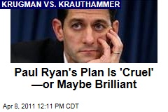 (Newser) - The battle lines around Paul Ryan's budget plan are pretty well laid today in columns from Paul Krugman, who calls it both "ludicrous" and "cruel," and Charles Krauthammer, who sees it as "brave and profoundly forward-looking." Excerpts: Krugman, New York Times : For starters, it relies... More »For Terror Alerts, Check Facebook